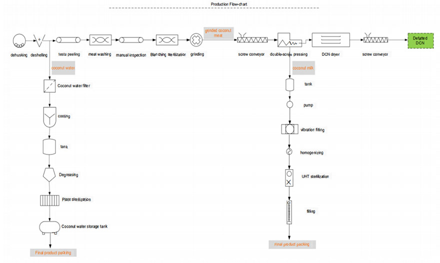 椰肉 → 粉碎 → 壓榨 → 過(guò)濾 → 攪拌 → 蒸發(fā) → 滅菌
